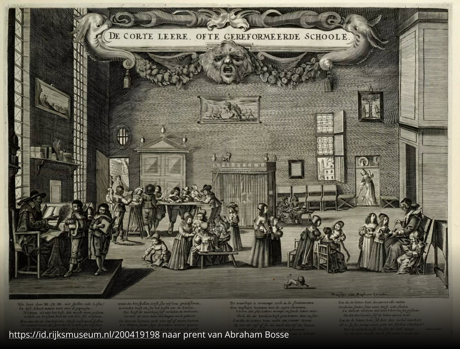 Hieronder is een schoolvertrek te zien, waarin links een schoolmeester aan een lessenaar aan twee jongens, rechts een schooljuffrouw aan drie meisjes aan de knie staande, onderwijs geeft. Van achteren links meerdere jongens staande aan een tafel; in het midden op de voorgrond spelende meisjes. Daar achter een ledikant etc. In het onderschrift 4 verzen van elk 8 regels, in het Nederlands, geschreven door Franciscus van den Enden 'Wie leert door BE.CE.DE. niet Spellen ende Lesen?....En tot haer innich merch sal comen 't eender uyr.’